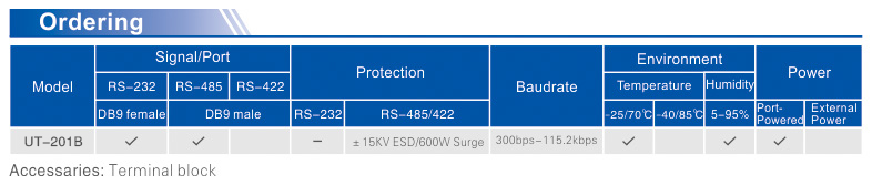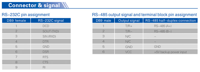 ● RS-232 DB9 female connector, RS-485 DB9 male connector, with terminal block