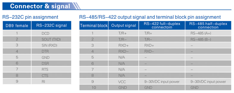 ● RS-232 DB9 female connector input; RS-422/485 10 bits terminal block output