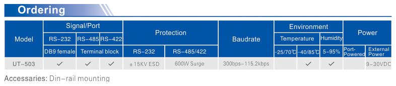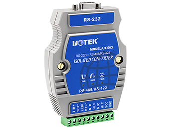 UT-503 is an industrial converter with optoelectronic isolation. It complies with RS-232C, RS422, and RS-485 standards; it converts single side RS-232 signal to a balanced differential RS-422 or RS-485 signal. The built-in optoelectronic isolator can provide as high as 2,500Vrm isolated voltage; the fast instant voltage restraint is designed to protect RS-422/RS-485 interface; it adopts advanced TVS (TRANSIENT VOLTAGE SUPPRESSOR) instant voltage restraint; normally, TVS tube is in high impedance state; when both sides of TVS tube suffer from high power impact in a sudden, the voltage restraint will fast lower the impedance from both sides, and absorb in big current; with this, the voltage on both sides are fixed at presupposed value, protects the component of circuit from damage. This voltage restraint provides 600W each wire with lightning and ESD protection, and surge voltage, instant overvoltage protection on circuit which causing by all reasons; the tiny interelectrode capacitance ensures high speed transmission for RS-422/485 ports. RS-232 connects with RS-232C standard port by DB9 female connector; RS-422/RS-485 adopts 10 bits terminal block as output. This converter is with built-in zero delay auto receiving and transmitting conversion and unique I/O circuit auto control data flow direction without any handshake signal (RTU, DTR); there is no need jumper wire setting for full duplex (RS-422) and half duplex (RS-485) mode, plug & play. It is compatible with current communication software and hardware, no need to set the previous working mode which base on RS-232.