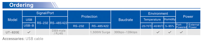 UT-820E is a universal USB to RS-485/422 converter which with built-in optoelectronic isolator and DC/DC power isolated module; external power is not necessary. It complies with USB and RS-485/422 standards; it converts single side USB signal to a balanced differential RS-422 or RS-485 signal. The built-in optoelectronic isolator can provide as high as 2,500Vrm isolated voltage; the fast instant voltage restraint is designed to protect RS-422/RS-485 interface; it adopts advanced TVS (TRANSIENT VOLTAGE SUPPRESSOR) instant voltage restraint; normally, TVS tube is in high impedance state; when both sides of TVS tube suffer from high power impact in a sudden, the voltage restraint will fast lower the impedance from both sides, and absorb in big current; with this, the voltage on both sides are fixed at presupposed value, protects the component of circuit from damage. This voltage restraint provides 1500W each wire with lightning and ESD protection, and surge voltage and instant overvoltage protection on circuit which causing by all reasons; the tiny interelectrode capacitance ensures high speed transmission for RS-422/485 ports. RS-485/422 port adopts RJ45 or DB9 male as connector. This converter is with built-in zero delay auto receiving and transmitting conversion and unique I/O circuit auto control data flow direction without any handshake signal (RTS, DTR); there is no need jumper wire setting for full duplex (RS-422) and half duplex (RS-485) mode, plug & play. It is compatible with current communication software and hardware.
