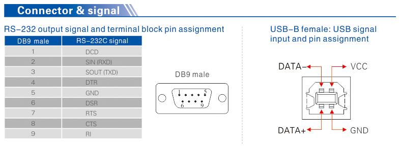 ● RS-232 signal: DCD, RXD, TXD, DTR, GND, DSR, RTS, CTS, RI