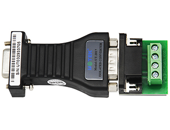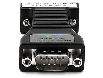 UT-2017 optoelectronic isolated port-powered converter provides connection for point to point, point to multipoint communication. For point to multipoint mode, each converter is allowed to connect 32 sets RS-485 devices with baudrate 300-115.2Kbps. The power and data flow indicators indicate the working status.