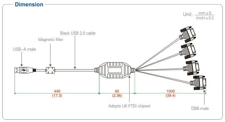 ● Connector: USB-A male, DB9 male