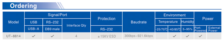 UT-8814 is a universal USB/4 ports RS-232 converter without external power. It complies with USB, RS-232 standards; it converts single side USB signal to RS-232. This converter is with built-in zero delay auto receiving and transmitting conversion and unique I/O circuit auto control data flow direction, plug & play. It is compatible with current communication software and hardware.