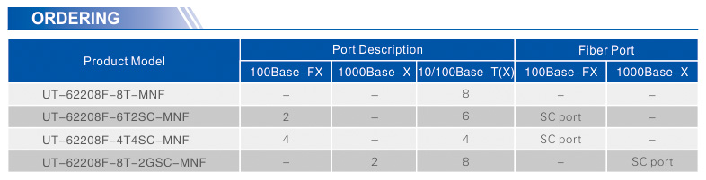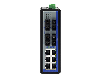 UT-62208F series are managed industrial Ethernet switches. It supports up to 10 ports, which included 2 Gigabit fiber ports, plug & play; it supports 1 console port, provides CLI management; and it supports industrial field Ethernet layer 2 protocol, this ensure the network stability. This switch is low power consumption; the fanless design prevents it from noise interference. The operating temperature range is from -40~85°C; together with EMC compatibility, these make the switch works stable under poor environment, which provides safe and reliable solution for industrial automation, intelligent transportation, video monitoring, and other industrial application networking access.