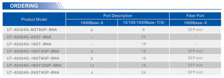 ● Operating temperature: -40~85℃UT-62424G series are full Gigabit managed industrial Ethernet switches. It supports up to 28 Gigabit ports, which included 12 Gigabit fiber ports; this enhances the networking flexibility. This series supports port mirroring, VLAN, igmp, QoS, stp/Rstp/Mstp, ACL, and other management, such as Console, Telnet, Web, SNMP, and relay alarm output; it supports layer 3 switching technology(static route/Rip/OSPF/VRRP), which provides safe and reliable solution for industrial automation, intelligent transportation, video monitoring, and other industrial application networking access.