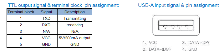 ● Connector: USB-A male, TTL 5-pin terminal block