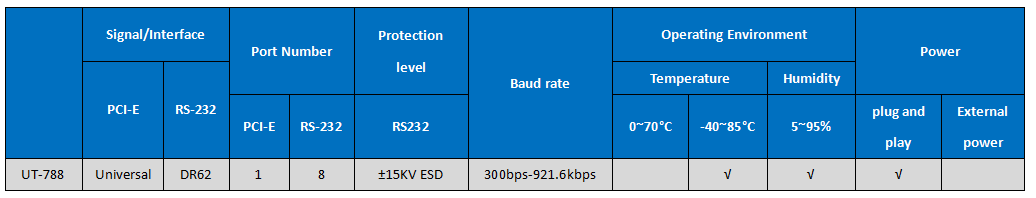 UT-788 is a general-purpose PCI-E serial card designed for POS, ATM and other applications that can be used in industrial automation system manufacturing and system integration. UT-788 provides 8 RS-232 serial ports that can connect to a wide range of serial devices such as PCs, terminals, modems, printers, scanners and more. Each port can reach a data rate of 921.6Kbps and provides modem control signals to ensure the compatibility of serial device peripherals.