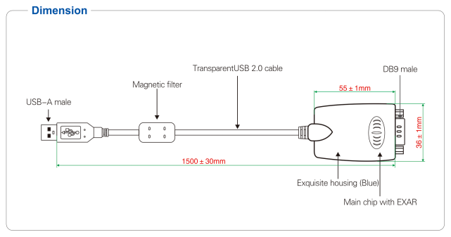 ● Interface form: USB end of the Class A interface male, DB9 male connector connection