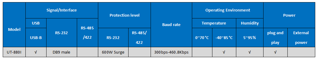 UT-880I interface converter is point to point, data communication rate 300-460800bps, with power indicator and data flow indicator can indicate the fault situation, support the communication mode of USB to RS-232 conversion.