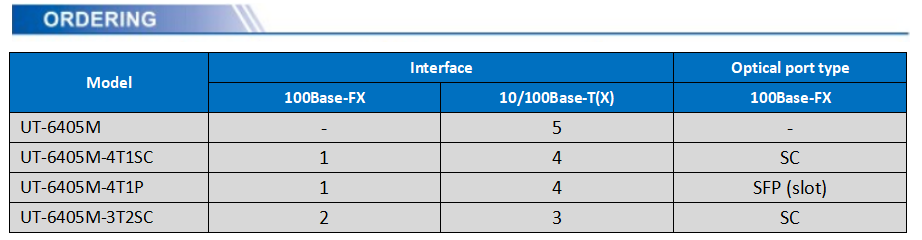 UT-6405M series is a 5-port 100M simple managed Ethernet switch. It provides fixed 4 10/100Base-T(X) Ethernet interface and 1 opto-electronic optional interface, which is plug-and-play; it provides one console port and supports CLI management; it adopts low power consumption and fanless design to ensure no noise interference, and also supports -40~85°C operating temperature and good EMC electromagnetic compatibility performance to ensure stable operation in harsh industrial environment. It provides a safe and reliable solution for factory automation, intelligent transportation, video surveillance and other industrial applications to set up a fast and stable network terminal access network.