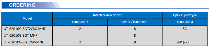 UT-62010G series is a managed industrial Ethernet switch, supporting 2 Gigabit optical ports and 8 Gigabit electrical ports, supporting 1 console port and providing CLI management; supporting Ethernet Layer 2 protocols required in industrial sites to ensure the stability of communication networks; this series switch adopts low power consumption and fanless design to ensure no noise interference, while supporting -40~85°C operating temperature With low power consumption and fanless design, it ensures no noise interference and supports -40~85°C operating temperature and good EMC performance to ensure stable operation in harsh industrial environment, providing a safe and reliable solution to build a fast and stable network terminal access network for industrial applications such as factory automation, intelligent transportation and video surveillance.