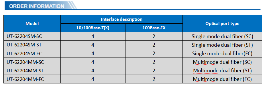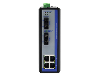 UT-62204 series are 6-port 100M unmanaged Ethernet switches, which all have 4 10/100Base-T(X) Ethernet interface and 2 100Base-FX port, plug-and-play; used for data communication between 10/100Base-T(X) twisted pair and 100 Base-FX cable, most suitable for intelligent cell or fiber to desktop connector, automatically adapts to the transmission rate of 10Mbps and 100Mbps, which is convenient for users to upgrade. It extends the limit of network transmission distance from 100M of twisted-pair cable to more than 100KM, which can easily realize the interconnection between motherboard servers, repeaters, hubs, terminals and terminators.