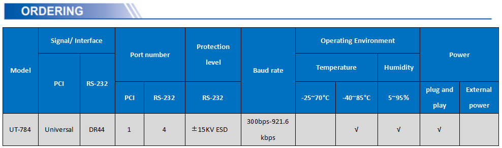 UT-784 is a universal PCI-E serial card designed for POS, ATM and other applications that can be used in industrial automation system manufacturing and system integration. UT-784 provides 4 RS-232 serial ports that can connect to a variety of serial devices such as PC, terminals, modems, printers, scanners, etc. Each port can reach a data rate of 921.6Kbps and provides modem control signals to ensure the compatibility of serial device peripherals.
