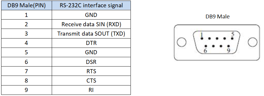 ● Signal: RS-232: DCD, RXD, TXD, DTR, GND, DSR, RTS, CTS, RI