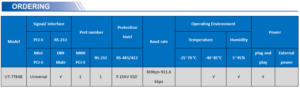 UT-7784B is a universal Mini PCI-E serial card designed for POS, ATM, and other applications for industrial automation system manufacturing and system integration.UT-7784B provides 4 RS-232 serial ports to connect a variety of serial devices such as PC, terminals, modems, printers, scanners, etc. Each port can reach a data rate of 921.6Kbps and provides modem control signals to ensure the compatibility of serial device peripherals.