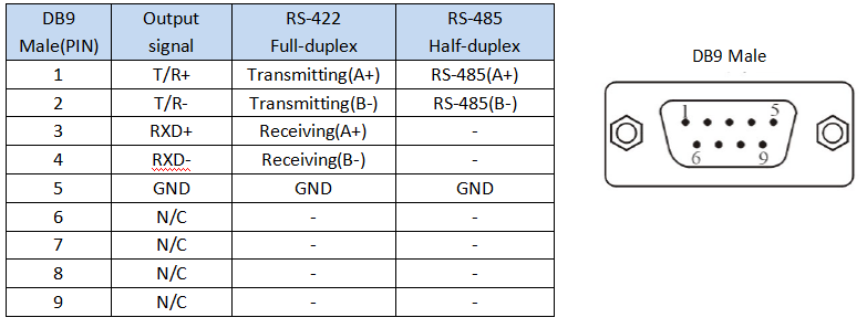 RS-422: T/R+, T/R-, RXD+, RXD-, GND