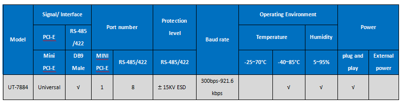 UT-7884 is a universal Mini PCI-E serial card designed for POS, ATM and other applications, which can be used in industrial automation system manufacturing and system integration.
