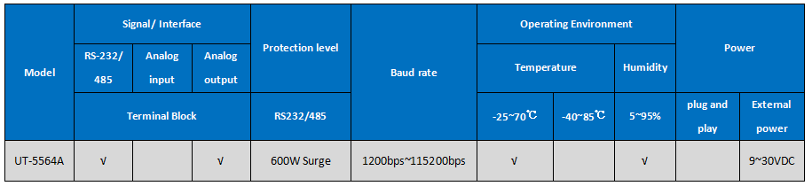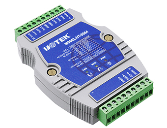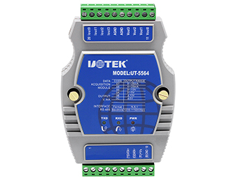 The UT-5564A is a remote analog output and control module that provides D/A digital input/analog output functions and supports -10V ~ +10V DC voltage signal and 0 ~ 20mA DC current signal output. The module can be remotely controlled by a series of commands via Modbus RTU protocol, and the module and the host computer communicate via RS-485 serial bus using command data form. The communication baud rate is software settable, and the maximum transmission rate can reach 115,200 bps.