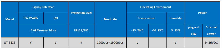 The UT-5518 opto-isolated data parallel I/O controller is an 8-bit, 8-channel data input module, with each data input channel resembling several computer interfaces. The module can be remotely controlled by a series of commands via Modbus-RTU protocol, and the module and the host computer communicate via RS-485/232 serial bus using command data. The communication baud rate is software settable and can reach a maximum transmission rate of 115,200bps.