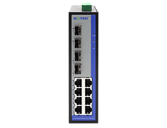 UT-60012GC series are unmanaged full Gigabit industrial Ethernet switches. It supports up to 4 Gigabit fiber ports and 8 Gigabit RJ-45 ports, this enhances the networking flexibility. This switch is low power consumption; the fan-less design prevents it from noise interference; the operating temperature range is from -40~75°C, it ensures the switch works stable in harsh industrial environment, and makes it provide with safe and reliable solutions for industrial automation, intelligent transportation, video surveillance, and other industrial application networking.