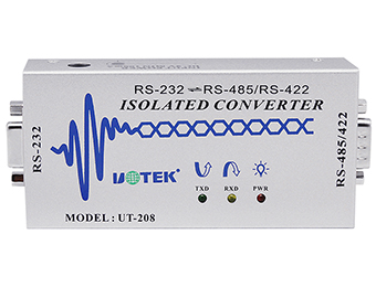 UT-208 optoelectronic isolated converter provides connection for point to point, point to multipoint communication. For point to multipoint mode, each converter is allowed to connect 128 sets RS-422 or RS-485 devices with baud rate 300-115.2Kbps. The power and data flow indicators indicate the working status.