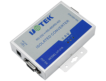 UT-218 is a converter with optoelectronic isolation. It complies with RS-232C, RS422, and RS-485 standards; it converts single side RS-232 signal to a balanced differential RS-422 or RS-485 signal. The built-in optoelectronic isolator can provide as high as 2,500Vrm isolated voltage; the fast instant voltage restraint is designed to protect RS-422/RS-485 interface; it adopts advanced TVS (TRANSIENT VOLTAGE SUPPRESSOR) instant voltage restraint; normally, TVS tube is in high impedance state; when both sides of TVS tube suffer from high power impact in a sudden, the voltage restraint will fast lower the impedance from both sides, and absorb in big current; with this, the voltage on both sides are fixed at presupposed value, protects the component of circuit from damage. This voltage restraint provides 1,500W each wire with lightning and ESD protection, and surge voltage and instant overvoltage protection on circuit which causing by all reasons; the tiny interelectrode capacitance ensures high speed transmission for RS-422/485 ports. RS-232 port connects with RS-232C standard port by DB9 female connector; RS-422/RS-485 adopts RJ-45 and DB9 male as connector.