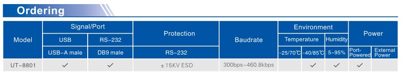 UT-8801 is a universal USB/RS-232 converter without external power. It complies with USB, RS-232 standards; it converts single side USB signal to RS-232. This converter is with built-in zero delay auto receiving and transmitting conversion and unique I/O circuit auto control data flow direction, plug & play. It is compatible with current communication software and hardware.