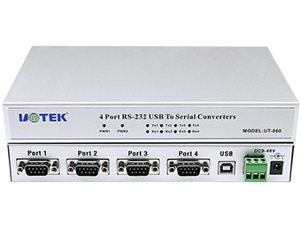 UT-860 is a port-powered universal USB/RS-232 converter; there is no need external power. It complies with USB and RS-232 standards; it converts single side USB signal to UART RS-232 signal. RS-232 port adopts DB9 male as connector. This converter is with built-in zero delay auto receiving and transmitting conversion and unique I/O circuit auto control data flow direction, plug & play. It is compatible with current communication software and hardware.