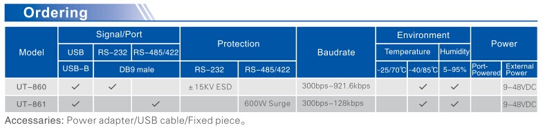 UT-860 converter provides connection for point to point communication, with baudrate 300-921.6Kbps. The power and data flow indicators indicate the working status.