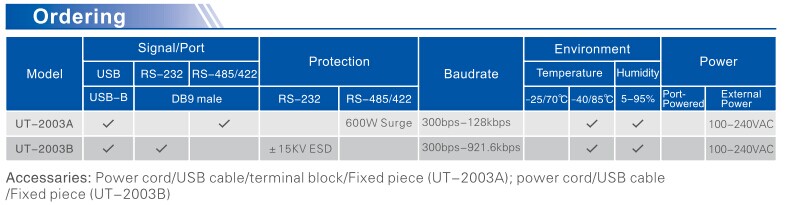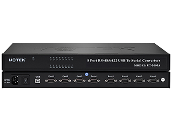 UT-2003A is a universal USB/RS-485/422 converter, which with built-in optoelectronic isolator and DC/DC power isolated module. It complies with USB, RS422, and RS-485 standards; it converts single side USB signal to a balanced differential RS-422 or RS-485 signal. The built-in optoelectronic isolator can provide as high as 2,500Vrm isolated voltage; the fast instant voltage restraint is designed to protect RS-422/RS-485 interface; it adopts advanced TVS (TRANSIENT VOLTAGE SUPPRESSOR) instant voltage restraint; normally, TVS tube is in high impedance state; when both sides of TVS tube suffer from high power impact in a sudden, the voltage restraint will fast lower the impedance from both sides, and absorb in big current; with this, the voltage on both sides are fixed at presupposed value, protects the component of circuit from damage. This voltage restraint provides 600W each wire with lightning and ESD protection, and surge voltage and instant overvoltage protection on circuit which causing by all reasons; the tiny interelectrode capacitance ensures high speed transmission for RS-422/485 ports. RS-422/RS-485 adopts DB9 male as connector. This converter is with built-in zero delay auto receiving and transmitting conversion and unique I/O circuit auto control data flow direction without any handshake signal (RTU, DTR); there is no need jumper wire setting for full duplex (RS-422) and half duplex (RS-485) mode, plug & play. It is compatible with current communication software and hardware.