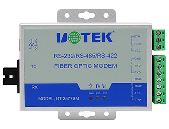 UT-2577SM fiber optic modem supports asynchronous RS-232/485/422 communication. It is the best choice to connect remote terminal unit (RTU) with HOST or SCADA controller. It supports RS-232/485/422 asynchronous protocols; it can be mixed and matched to use 2 RS-232, RS-485 or RS-422 ports, and it supports 2 wires (half-duplex) RS-485 and 4 wires (full-duplex) RS-422 mode. The RS-485 mode supports data transmission (TXD or SD) control, this enhance the adaptation to most of the software. Optic fiber MODEM supports lots of optic connection between asynchronous serial ports. It supports 2 asynchronous serial devices to communicate under full-duplex or half-duplex via optic fiber; the communication distance can be as far as 4km at multimode, and 20km at single mode. The fastest transmission rate for RS-232 can be 115.2Kbps, and for RS-485/422 can be 460Kbps. Ports with different electronic standards can be mixed and matched to use; it is without problem to connect RS-232 devices with RS-485/422 devices. This is a good replacement of RS-232 to RS485/422 converter, which with EMI/RFT features.