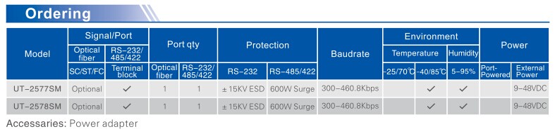 UT-2577SM supports two signal data transmission: transmit and receive data. At the same time, it is with RS-485/422 data transmission auto control circuit; Zero delay conversion; all the serial ports is connected via terminal block.