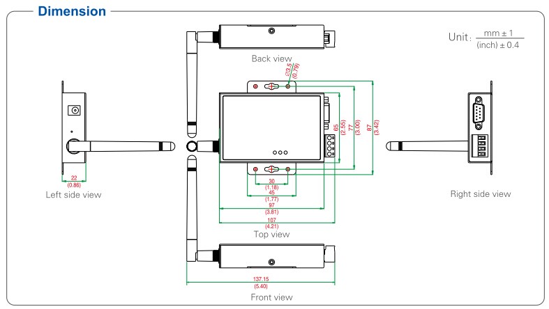 ● Transmission distance: Wireless carrier 433MHz 300m (Maximum power transmitting empty range RS-232 5O m (1200bps-384bps) ,RS-485/422 1200m (1200b(bps-38400bps)