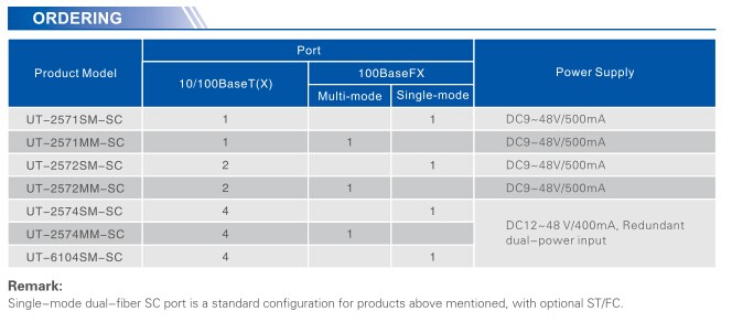 The UT-2571 10/100M 1 fiber 1 RJ-45 port switch is used for data communication between 100Base-TX twisted-pair and 100Base-FX optic fiber cable. It is your best choice for intelligent communities or fiber to the desk (FTTD) solution. It supports 10/100Mbps, auto negotiation. It extends the network distance from 100M to 100KM or above, this easily implements interconnection of motherboard servers, relays, hubs and terminals.