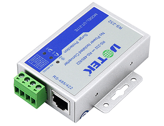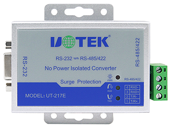 UT-217E is a port-powered converter with optoelectronic isolation. It complies with RS-232C, RS422, and RS-485 standards; it converts single side RS-232 signal to a balanced differential RS-422 or RS-485 signal. The built-in optoelectronic isolator can provide as high as 2,500Vrm isolated voltage; the fast instant voltage restraint is designed to protect RS-422/RS-485 interface; it adopts advanced TVS (TRANSIENT VOLTAGE SUPPRESSOR) instant voltage restraint; normally, TVS tube is in high impedance state; when both sides of TVS tube suffer from high power impact in a sudden, the voltage restraint will fast lower the impedance from both sides, and absorb in big current; with this, the voltage on both sides are fixed at presupposed value, protects the component of circuit from damage. This voltage restraint provides 600W each wire with lightning and ESD protection, and surge voltage and instant overvoltage protection on circuit which causing by all reasons; the tiny interelectrode capacitance ensures high speed transmission for RS-422/485 ports. RS-232 port connects with RS-232C standard port by DB9 female connector; RS-422/RS-485 adopts RJ-45 and 4 bits terminal block as output.